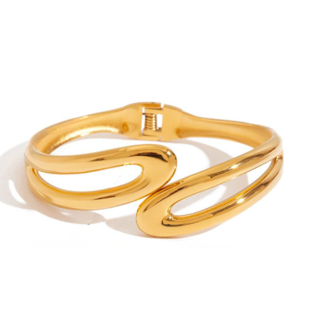 Ta sztywna bransoletka została wykonana z wysokiej jakości stali szlachetnej i pokryta warstwą 18-karatowego złota, co nadaje jej subtelnego blasku i nowoczesnej elegancji.