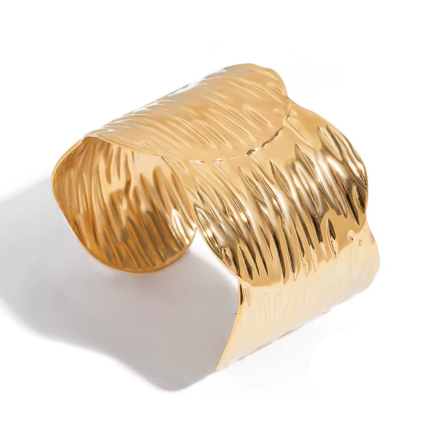 Klasyczna forma, nowoczesna siła wyrazu. Ta szeroka, gładka bransoletka typu mankiet została wykonana z trwałej stali szlachetnej pokrytej 18-karatowym złotem, co nadaje jej elegancki blask i ponadczasowy charakter.