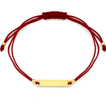 Precyzyjnie wykonana bransoletka z żółtego złota próby 585. Czerwony sznureczek został ozdobiony blaszką pod grawer, co sprawia, że dzięki personalizacji będzie ciekawym pomysłem na prezent.