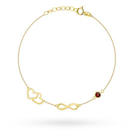 Elegancka bransoletka ze złota próby 585 to wyjątkowa biżuteria łącząca romantyczne symbole i subtelny blask. Motyw połączonych serc oraz znak nieskończoności symbolizują miłość, trwałość i więź bez końca, nadając całości głębokiego, emocjonalnego znaczenia.