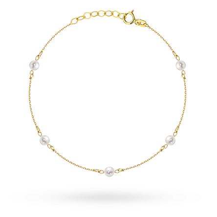 Precyzyjnie wykonana złota bransoletka próby 585 zdobiona delikatnymi perełkami.