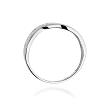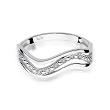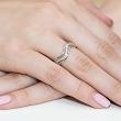 Pierścionek został udekorowany brylantami ułożonymi w jak gdyby płynącej linii, dzięki czemu nadaje mu opływowego kształtu, zaś unikalny wzór pierścionka z pewnością podkreśla jego ciekawą konstrukcję.
