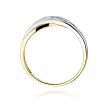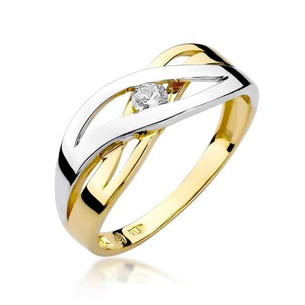Widowiskowy pierścionek wykonany z najwyższej jakości lśniącego dwukolorowego złota próby 585, który w subtelny sposób podkreśla blask brylantu w kolorze białym, którym został ozdobiony (masa 0,10 ct, czystość SI2 oraz barwa H).