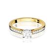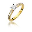 Dodatkowo kamienie szlachetne w szlifie brylantowym o łącznej masie 0,12 ct (14 x 0,0086ct) zostały w nieprzeciętny sposób usytuowane na szynie, dzięki czemu podkreślają wysublimowany charakter centralnie usytuowanego brylantu, zaś harmonijny design pierścionka nadaje mu romantycznego, a zarazem unikalnego wyglądu. Bardzo dobra czystość i biel Si2/H tworzy harmonijne połączenie brylantów z polerowanym złotem.