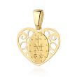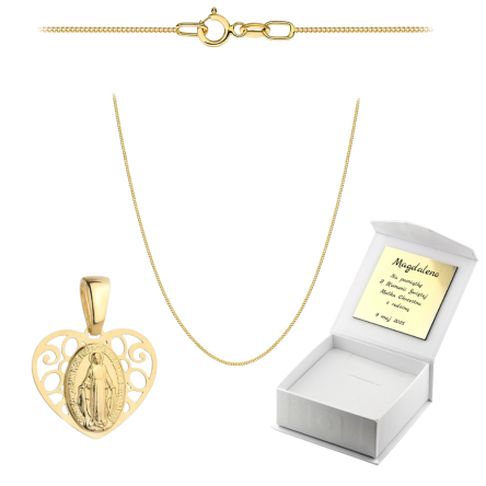 Złoty komplet wykonany ze złota próby 375 o symbolice religijnej, który składa się ze złotego medalika z Matką Boską Niepokalaną w ażurowym sercu oraz złotego łańcuszka o splocie pancerka gładka.
