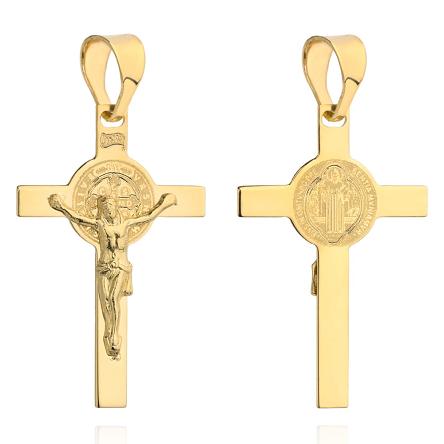 Precyzyjnie wykonany złoty krzyżyk próby 585 z wizerunkiem Św. Benedykta symbolizuje błogosławieństwo, potężną ochronę przed złem i duchową siłę. Zawiera inicjały łacińskiego egzorcyzmu. Główny Patron Europy a także pracowników, studentów i osób poszukujących ochrony przed złymi duchami.