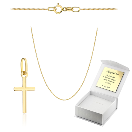 Złoty komplet wykonany ze złota próby 375 o symbolice religijnej, który składa się ze złotego żłobionego krzyżyka oraz złotego łańcuszka o splocie pancerka gładka.