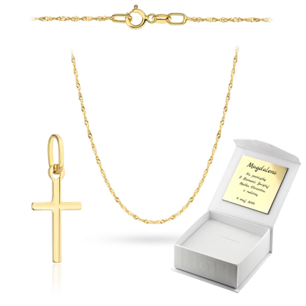 Złoty komplet wykonany ze złota próby 375 o symbolice religijnej, który składa się ze złotego żłobionego krzyżyka oraz złotego łańcuszka o splocie singapur.