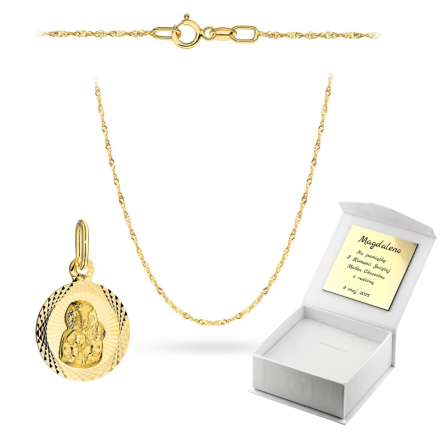 Złoty komplet wykonany ze złota próby 375 o symbolice religijnej, który składa się ze złotego medalika z Matką Boską Częstochowską w diamentowanym kółeczku oraz złotego łańcuszka o splocie singapur.