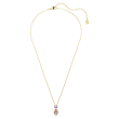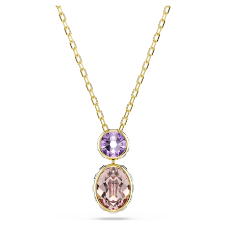 Pozłacana oprawa podkreśla elegancję projektu, a centralny fioletowy kryształ przyciąga spojrzenia subtelnym blaskiem. Poniżej umieszczono większy, dwustronny kryształ, który z jednej strony zachwyca bezbarwną czystością, a z drugiej romantycznym odcieniem różu. Wystarczy delikatny obrót, aby nadać naszyjnikowi zupełnie nowy wyraz.