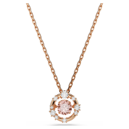 Centralnym elementem naszyjnika jest ruchomy kryształ Swarovski (dancing stone), który porusza się przy każdym ruchu, tworząc niekończące się refleksy światła. Otaczają go drobne cyrkonie Swarovski Zirconia, precyzyjnie osadzone w metalowej oprawie pokrytej powłoką w kolorze rose gold, nadającej całości ciepły, elegancki charakter.