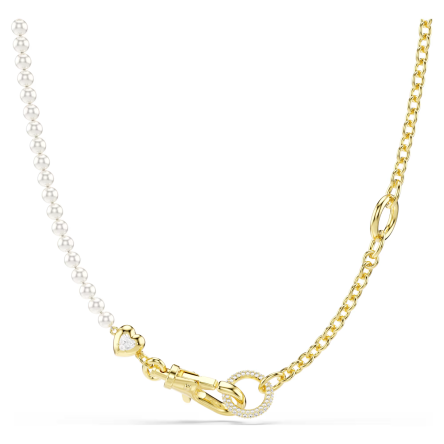 Ten wyjątkowy naszyjnik Swarovski to połączenie klasycznej elegancji i nowoczesnej formy. Projekt opiera się na kontrastowym zestawieniu pozłacanego łańcuszka z rzędem białych pereł Swarovski Crystal Pearls, tworząc biżuterię, która przyciąga uwagę subtelnym blaskiem i ponadczasowym stylem.