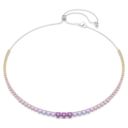 Nadając nowy wymiar ikonicznemu projektowi, kola Swarovski Matrix zachwyca dynamiczną grą koloru i formy. Wykonana w rodowanym wykończeniu, prezentuje świetlisty sznur okrągło szlifowanych kryształów, które płynnie przechodzą przez pastelowy gradient rozmiarów i odcieni różu, fioletu oraz żółci.