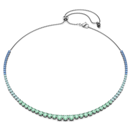 Ten wyjątkowy naszyjnik Matrix nadaje świeżą, nowoczesną interpretację kultowej sylwetce Swarovski. Wykonany w rutenowym wykończeniu, zachwyca dynamicznym gradientem okrągło szlifowanych kryształów, które płynnie przechodzą przez odcienie zieleni i błękitu, tworząc hipnotyzującą grę refleksów.