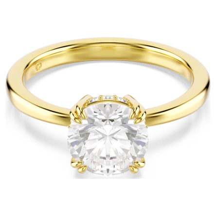 Ten zachwycający drobiazg inspirowany pięknem kosmosu tworzy swój własny, wypełniony światłem wszechświat. Pokryta powłoką w kolorze złota ozdoba składa się z obrączki wysadzanej kryształami w oprawie brukowej i pierścionka typu solitaire, również ozdobionego kryształami w oprawie brukowej, oraz dużej, centralnie umieszczonej cyrkonii Swarovskiego. Promienny przykład savoir-faire marki Swarovski, który doskonale sprawdzi się jako prezent.