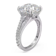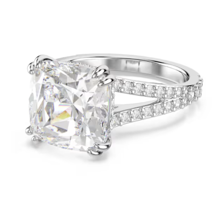 Centralnym elementem jest kamień o kwadratowym szlifie, osadzony w podwójnej oprawie typu prong, która podkreśla jego czystość i intensywny blask.