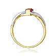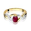 Czarujący pierścionek wykonany został z najwyższej jakości kruszcu - lśniącego dwukolorowego złota próby 585 oraz jednego, centralnie usytuowanego rubinu o masie 0,60 ct! Oryginalna konstrukcja szyny pierścionka - splecionych dwóch kolorów kruszcu, zdobionych kamieniami szlachetnymi w szlifie brylantowym o łącznej masie 0,05 ct (czystość SI2, barwa H) - w uroczy sposób eksponuje wytworny charakter rubinu, nadając mu niezwykłego uroku.