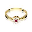 Reprezentatywny pierścionek wykonany z najwyższej jakości żółtego złota próby 585 oraz jednego, centralnie usytuowanego rubinu (masa 0,15ct), otoczonego mniejszymi brylantami o łącznej masie 0,12ct (czystość SI2, barwa H).
