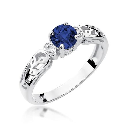 Luksusowy pierścionek wykonany z najwyższej jakości lśniącego białego złota próby 585, ozdobiony brylantami o łącznej masie 0,02 ct oraz szafirem o masie 0,50ct! Diamenty w szlifie brylantowym o bardzo dobrej czystości i bieli Si2/H tworzą harmonijne połączenie z polerowanym złotem oraz podkreślają niezwykły blask i wielkość szafiru, nadając kobiecej dłoni strojnego wyglądu!