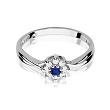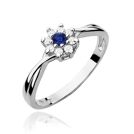 Uroczy pierścionek wykonany z najwyższej jakości lśniącego białego złota próby 585 oraz jednego, centralnie usytuowanego szafiru o masie 0,15 ct, otoczonego kamieniami szlachetnymi w szlifie brylantowym o łącznej masie 0,12 ct (czystość SI2, barwa H).