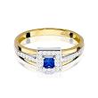 Reprezentatywny pierścionek wykonany z najwyższej jakości lśniącego dwukolorowego złota próby 585, udekorowanego nieskazitelnie mieniącymi się kamieniami szlachetnymi w szlifie brylantowym o łącznej masie 0,14 ct (czystość SI2, barwa H) oraz usytuowanym na środku szafirem o masie 0,20 ct.