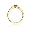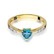Pierścionek wykonany z najwyższej jakości lśniącego żółtego złota próby 585, ozdobiony topazem - w kształcie serca - o masie 0,30 ct oraz brylantami ułożonymi wzdłuż szyny pierścionka (masa 0,03 ct, czystość SI2, barwa H). Diamenty w szlifie brylantowym tworzą harmonijne połączenie z polerowanym złotem, delikatnie wtapiając się w konstrukcję pierścionka, jednocześnie podkreślając niezwykły kształt topazu.