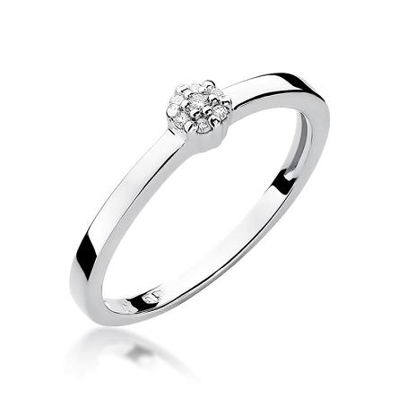 Uroczy, a zarazem subtelny pierścionek wykonany z najwyższej jakości lśniącego białego złota próby 585, udekorowanego nieskazitelnie mieniącymi się kamieniami szlachetnymi w szlifie brylantowym o łącznej masie 0,04 ct (czystość SI2, barwa H) tworzącymi efekt delikatnego kwiatu.