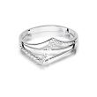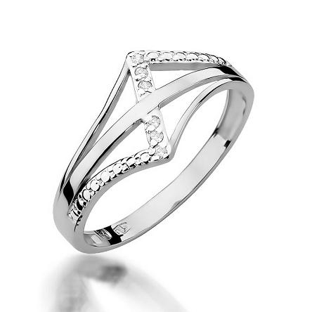 Nieszablonowy pierścionek wykonany został z najwyższej jakości lśniącego białego złota próby 585, który w subtelny sposób podkreśla blask brylantów którymi został ozdobiony (łączna masa 0,03 ct, czystość SI2 oraz barwa H).