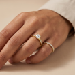 Centralnym elementem pierścionka jest efektowna, biała cyrkonia osadzona w eleganckiej, złotej oprawie, która pięknie eksponuje kamień i pozwala mu maksymalnie odbijać światło. Dodatkowe, drobne cyrkonie umieszczone w górnej części obrączki subtelnie rozświetlają całość, dodając pierścionkowi lekkości i luksusowego charakteru.