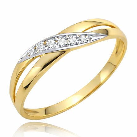 Centralną część pierścionka zdobi delikatna linia białych, lśniących cyrkonii, osadzonych w srebrzystej oprawie, która pięknie kontrastuje z żółtym złotem i dodatkowo podkreśla blask kamieni. Przeplatający się motyw nadaje biżuterii lekkości i nowoczesnego charakteru, zachowując przy tym klasyczną elegancję.