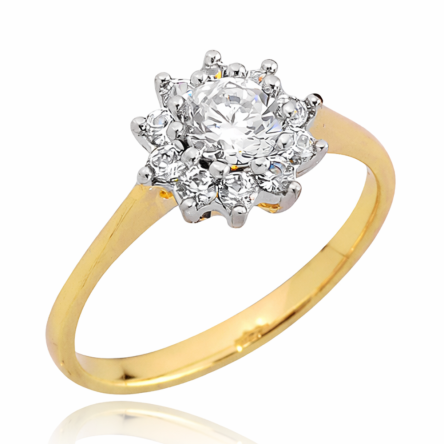 Delikatny i niezwykle kobiecy pierścionek wykonany z żółtego złota stanowi ponadczasowy symbol elegancji. Jego centralnym punktem jest kompozycja z białych cyrkonii — główny kamień otoczony drobniejszymi, tworzącymi efekt subtelnej gwiazdy lub kwiatowego blasku. Kamienie pięknie odbijają światło przy każdym ruchu dłoni, dodając biżuterii szyku i klasy.