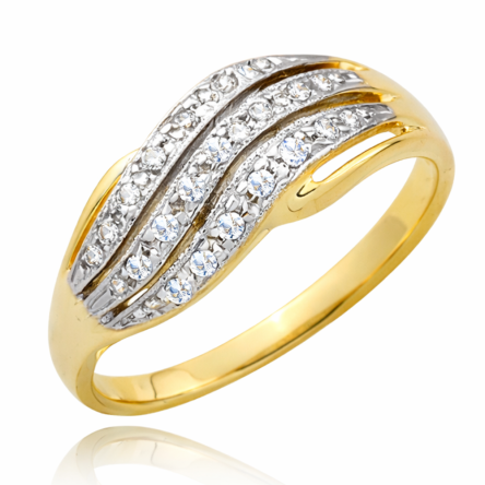 Pierścionek wykonany z dwukolorowego złota próby 585. Pierścionek ozdobiony został cyrkoniami.