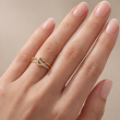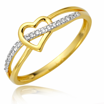 Romantyczny pierścionek wykonany z najwyższej jakości lśniącego blaskiem dwukolorowego złota próby 585, ozdobiony cyrkoniami usytuowanymi na subtelnej wstążce przeplatającej centralnie usytuowane serduszko.