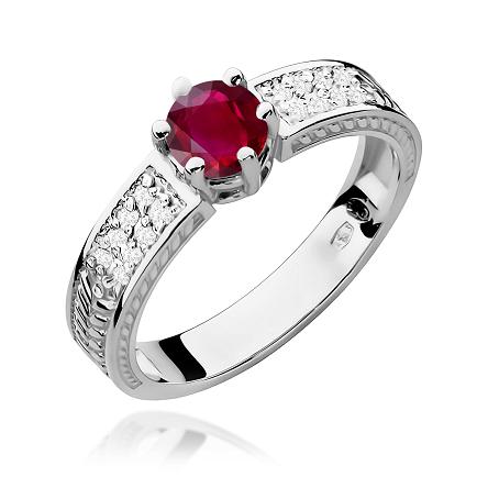 Efektowny pierścionek wykonany z lśniącego białego złota próby 585, udekorowany centralnie usytuowanym rubinem o masie 0,60 ct!