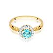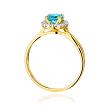 Wokół topazu- w ciekawej konstrukcji - zostały umiejscowione białe brylanty o łącznej masie 0,08 ct (16 x 0,005ct), czystości SI2 i barwie H, które subtelnie podkreślają blask żółtego złota.