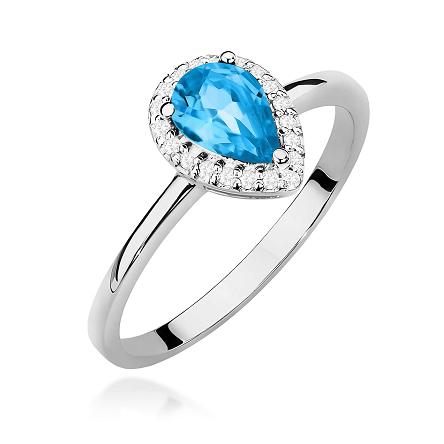Wokół topazu- w ciekawej konstrukcji - zostały umiejscowione białe brylanty o łącznej masie 0,10 ct (20 x 0,005ct), czystości SI2 i barwie H, które subtelnie podkreślają chłodny blask białego złota.