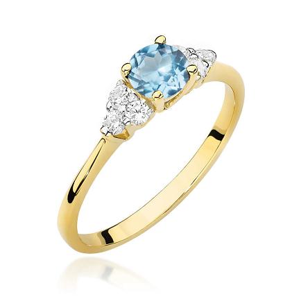 Wokół topazu- w ciekawej konstrukcji - zostały umiejscowione białe brylanty o łącznej masie 0,18 ct (6 x 0,03ct), czystości SI2 i barwie H, które subtelnie podkreślają blask żółtego złota.