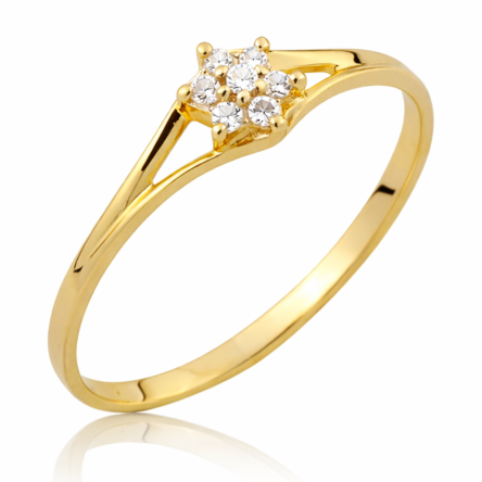 Reprezentatywny pierścionek wykonany został z najwyższej jakości lśniącego żółtego złota próby 333 oraz jednej dużej centralnie usytuowanej cyrkonii, otoczonej mniejszymi cyrkoniami.
