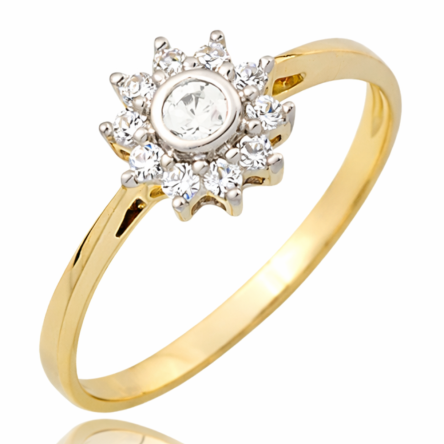 Reprezentatywny pierścionek wykonany został z najwyższej jakości lśniącego żółtego złota próby 333 oraz jednej dużej centralnie usytuowanej cyrkonii, otoczonej mniejszymi cyrkoniami.
