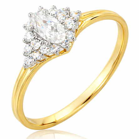 Reprezentatywny pierścionek wykonany został z najwyższej jakości lśniącego żółtego złota próby 333 oraz jednej dużej centralnie usytuowanej cyrkonii, otoczonej mniejszymi cyrkoniami.