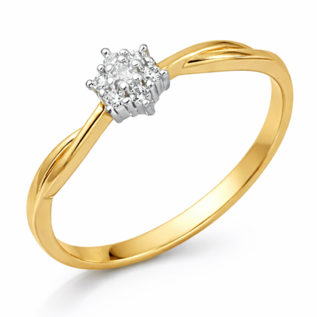 Reprezentatywny pierścionek wykonany został z najwyższej jakości lśniącego żółtego złota próby 585 oraz jednej dużej centralnie usytuowanej cyrkonii, otoczonej mniejszymi cyrkoniami.