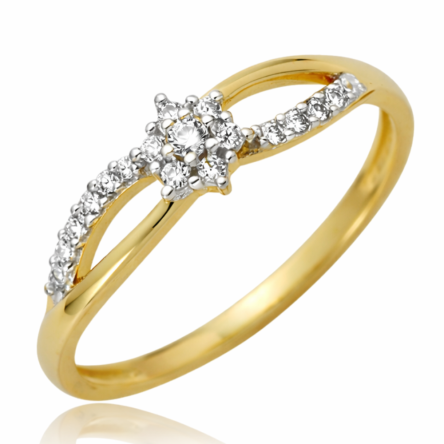 Reprezentatywny pierścionek wykonany został z najwyższej jakości lśniącego żółtego złota próby 333 oraz jednej dużej centralnie usytuowanej cyrkonii, otoczonej mniejszymi cyrkoniami.
