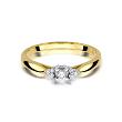 Uroczy, a zarazem subtelny pierścionek wykonany z najwyższej jakości lśniącego dwukolorowego złota próby 585, udekorowanego nieskazitelnie mieniącymi się kamieniami szlachetnymi. Główny brylant o masie 0,10ct ozdobiony został po bokach mniejszymi kamieniami o łącznej masie 0,03ct (czystość SI2, barwa H).