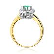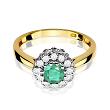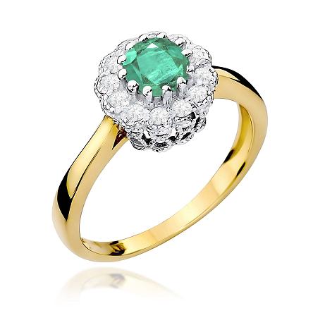 Luksusowy pierścionek wykonany z najwyższej jakości lśniącego dwukolorowego złota próby 585, ozdobiony brylantami o łącznej masie 0,17 ct oraz szmaragden o masie 0,50 ct! Diamenty w szlifie brylantowym o bardzo dobrej czystości i bieli Si2/H tworzą harmonijne połączenie z polerowanym złotem oraz podkreślają niezwykły blask i wielkość szmaragdu, nadając kobiecej dłoni zjawiskowego wyglądu!