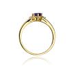 Reprezentatywny pierścionek wykonany z najwyższej jakości żółtego złota próby 375 oraz jednego, centralnie usytuowanego tanzanitu (masa 0,50ct), otoczonego mniejszymi brylantami o łącznej masie 0,03ct (czystość SI2, barwa H).