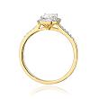 Zachwycający pierścionek zaręczynowy wykonany z najwyższej jakości złota próby 585. Główny kamień – ośmiokątny diament laboratoryjny o wielkości 0,60 ct, czystości VS2 i barwie F – olśniewa swoim doskonałym blaskiem i klarownością. Jego piękno podkreślone zostało za pomocą dodatkowych diamentów laboratoryjnych (łączna masa 0,19 ct) znajdujących się wokół centralnego kamienia i na szynie pierścionka, co dodaje mu elegancji i finezji.