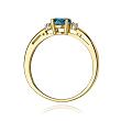 Elegancki pierścionek wykonany z najwyższej jakości żółtego złota próby 585 oraz jednego, centralnie usytuowanego topazu London Blue (masa 0,50 ct), otoczonego mniejszymi brylantami o łącznej masie 0,03 ct (czystość SI2, barwa H).