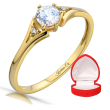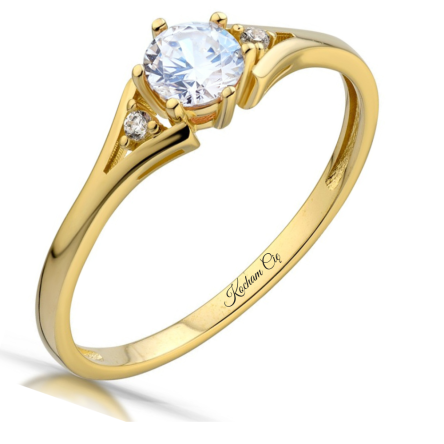 Zachwycający klasyczny pierścionek wykonany został z najwyższej jakości lśniącego żółtego złota próby 333 oraz jednej dużej centralnie usytuowanej białej cyrkonii, otoczonej mniejszymi kamieniami.
