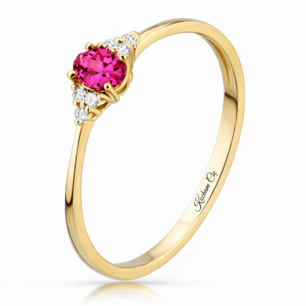 Zachwycający klasyczny pierścionek wykonany został z najwyższej jakości lśniącego żółtego złota próby 333 oraz jednej dużej centralnie usytuowanej różowej cyrkonii, otoczonej mniejszymi kamieniami.