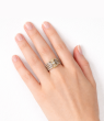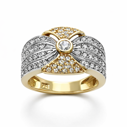 Połączenie żółtego złota z chłodnym, srebrzystym połyskiem oraz kunsztownie ułożonymi cyrkoniami nadaje pierścionkowi niezwykle wytwornego charakteru. To biżuteria stworzona dla kobiet, które kochają klasyczną elegancję w luksusowym wydaniu ponadczasowa, wyrazista i pełna uroku.